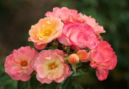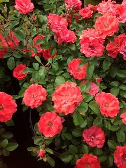 Роза шраб Coral Drift (Корал Дрифт). Чашевидные, яркие, кораллово-оранжевые цветки с нежно-розовым пятном-глазком в центре, из 20-25 лепестков появляются в течение всего сезона в многочисленных соцветиях. Куст округлой формы, с поникающими побегами и мелкой, темно-зеленой, полу-глянцевой листвой.