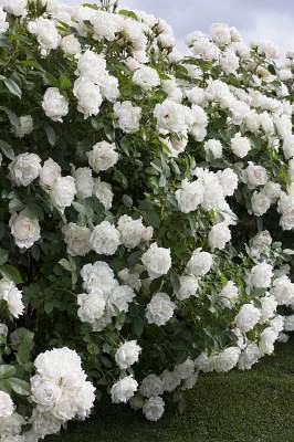 Роза Creme Chantilly (Крем Шантийи). Цветки диаметром 7 см, махровые (около 40 лепестков), белые или белые с розоватым оттенком, в центре с румянцем, в соцветиях по 6-15 шт. Цветение обильное, почти непрерывное. Листва матовая, светло-зелёная, высокоустойчивая к болезням. Куст высотой 40-60 см.