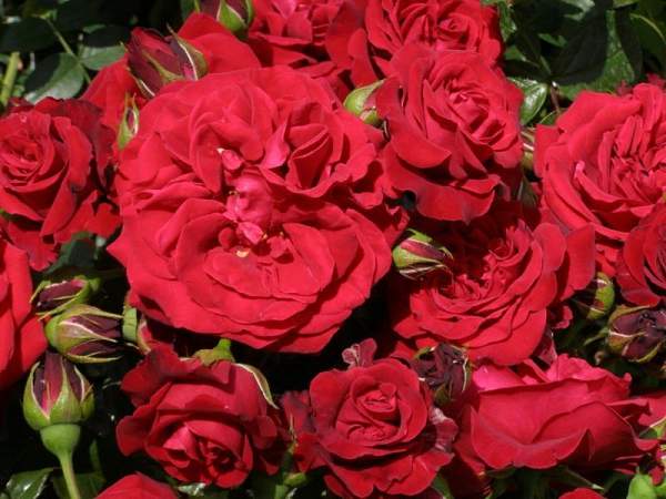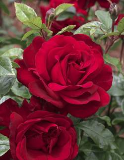Роза Cumberland (Кумберленд). Превосходная плетистая роза. Крупные (10 см) цветы из 40 лепестков глубокого тёмно-красного цвета. Куст легко формируется для использования на решётках. Листва очень декоративная, блестящая. Старая тёмно-зелёного цвета, а новая нежно-зелёного с красной каймой по краю. Хорошо растёт на рыхлой дренированной почве. На тяжелой практически не даёт прироста. Цветки темно-красные, махровые, ароматные.