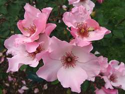 Роза Dainty Bess (Дэйнти Бесс). Существует не так много немахровых чайно-гибридных роз, но Dainty Bess больше, чем просто диковинка — это действительно очаровательная садовая роза. Густо-розовые бутоны раскрываются в широкие, плоские, немахровые цветки 10-12 см в диаметре, которые появляются по одному или в небольших кистях. Слегка волнистые лепестки нежно-розовые сверху и немного темнее с изнанки, они окружают пучок золотисто-коричневых или темно-красных тычинок.