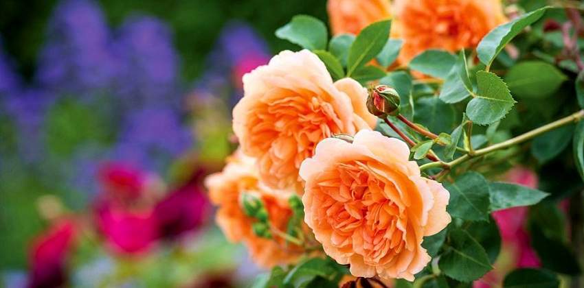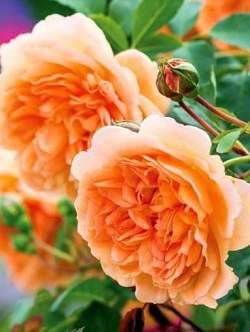 Роза шраб Dame Judi Dench (Дама Джуди Денч). Прекрасная роза с цветками насыщенного абрикосового цвета, красиво белеющими к краям. Бутоны яркие красноватые, раскрываются в крупные неформальные розетки с "пуговкой" в центре и нежным ароматом чайных роз. Цветки махровые, очень устойчивые к дождю. Лепестки облетают аккуратно.