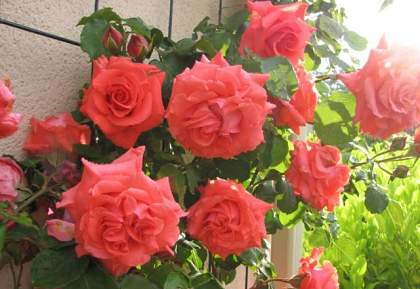 Роза Dee Dee Bridgewater (Ди Ди Бриджуотер). Отличная роза, цветет почти непрерывно, дождя не боится, на солнце не плавится. Цветет почти непрерывно и чрезвычайно обильно. Растет роза быстро, достигает высоты 3 м, побеги колючие, а листва крупная, матовая. Цветки очень крупные, великолепной формы, интересного кораллово-розового цвета. Цветок держится не менее 10 дней.