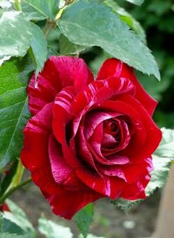 Роза Deep Impression (Дип Импрешн). Для поклонников полосатых роз этот сорт — находка. Цветок великолепный, темно-красный с розовыми штрихами и полосками, прекрасной формы. Диаметр около 10 см. Цветок имеет легкий аромат малины. Куст красивый, хорошо нарастает. Листва темно-зеленая, блестящая.