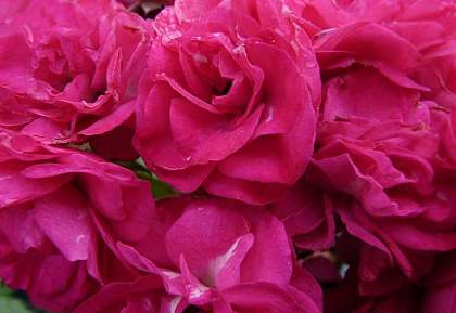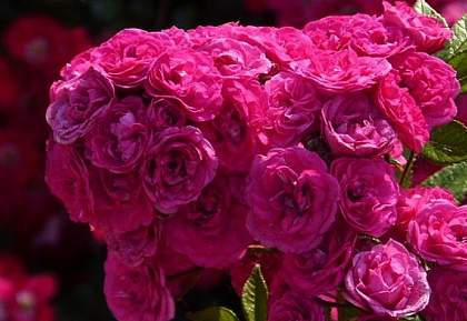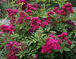 Роза Dinky (Динки). Прямостоячий непрерывно цветущий сорт с карминно-розовыми цветками в крупных кистях. Цветки прекрасно выдерживают дождь. Очень долго стоит в срезке.