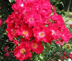 Роза плетистая Dortmund (Дортмунд). Гибрид Kordesii. Привлекающий внимание невысокий клаймбер, покрытый крупными (11-12 см), открытыми, немахровыми цветками с легким ароматом в крупных кистях. Они яркого, красивого красного цвета с крупным белым пятном в центре и пучком ярко-желтых тычинок. Комбинация очень яркая, но такой цвет сложно комбинировать. Листва блестящая, очень темная, устойчивая к заболеваниям. Для стимулирования повторного цветения следует обрезать образующиеся плоды. Куст ветвистый, достигает 3 м.