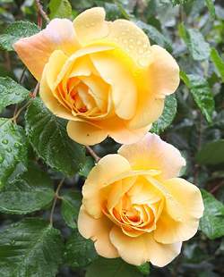Роза Easlea's Golden Rambler (Ислис Голден Рамблер). Золотисто-желтые, средне-махровые, крупные цветки с сильным чайным ароматом. Листва темно-зеленая, глянцевая. Куст густой, с колючими побегами.