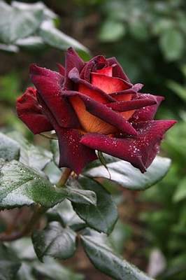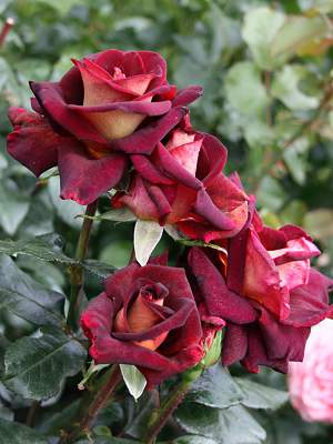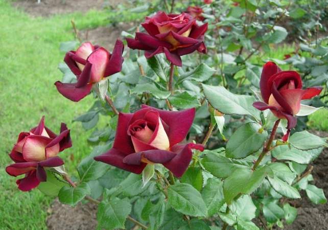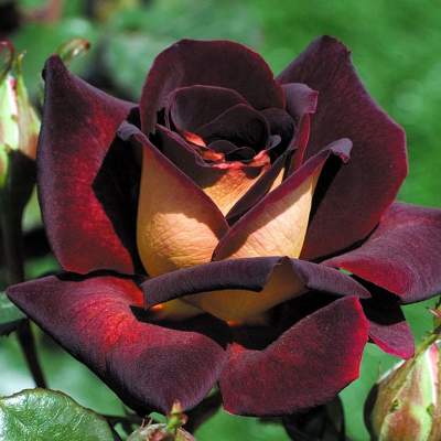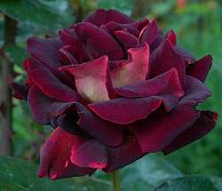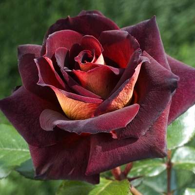 Роза чайно-гибридная Eddy Mitchell (Эдди Митчел). Цветки бархатисто-красные, позднее почти чёрные, с золотисто-жёлтой изнанкой. Размер цветка 10 см. Аромат очень слабый или отсутствует. Цветки бокаловидные, около 30 лепестков, появляются обычно по одному.
