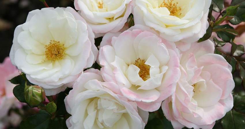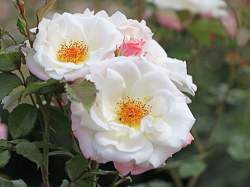 Роза Eisprinzessin (Айспринцессин). Бутон персиково-белый, округлой формы. Цветки крупные (8-10 см в диаметре), полумахровые, плоскочашевидные. Окрас розы белоснежный с нежно-розовой окантовкой по краям лепестков. В центре розы пучок золотистых тычинок. Аромат слабый. Цветы появляются в соцветиях по 3 — 5 бутонов на кисти. Цветки хорошо переносят дождь и сохраняют свою форму.