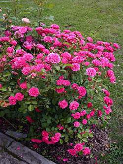 Роза Elmshorn (Эльмшорн). Elmshorn — великолепный шраб, идеальный для мест, где нужен массовый эффект на расстоянии, но хорошо смотрится и в миксбордере. Цветки вначале бледно-малиновые, затем густо-розовые, в жару по краям выгорают до бледно-розовых. Они чашевидные, с массой коротеньких лепестков, позднее приобретают форму помпонов, и отличаются великолепным свойством чисто сбрасывать лепестки после отцветания.