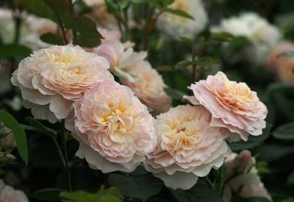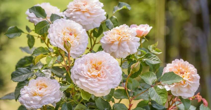 Роза шраб Emily Bronte (Эмили Бронте). Очень красивая роза с довольно самобытными сильно ароматными цветками. Цветки махровые, аккуратные, плоской формы, нежно-розовые с абрикосовой серединкой. Серединка состоит из более мелких лепестков. Аромат сильный, чая и старинных роз с восхитительными нотками лимона и грейпфрута.