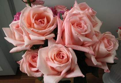 Роза Engagement (Энгейджмент). Цветки кораллово-розовые, классической формы с высоким бокалом. Диаметр цветка 8 см. Аромат слабый. Куст вертикальный, листья темно-зеленые, крупные. Высота куста до 150 см. Прекрасна для срезки. Цветет в течение всего сезона.