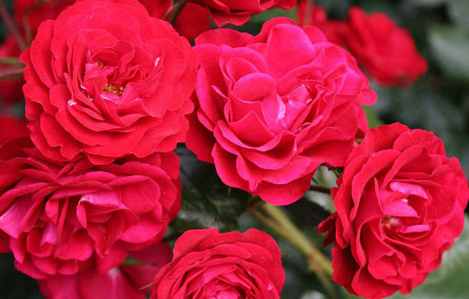Роза Europeana (Европеана). Спустя много лет после выведения, Europeana все еще остается выдающейся розой. Сложно что-то противопоставить этим крупным кистям ярко-малиновых цветков, оттененных молодой красноватой листвой. Цвет усиливается при посадке с белыми полиантовыми розами или серебристолистными многолениками. Цветки появляются в большом количестве, в крупных кистях по 10-30 шт. Они розетковидные, и долго не опадают.