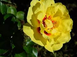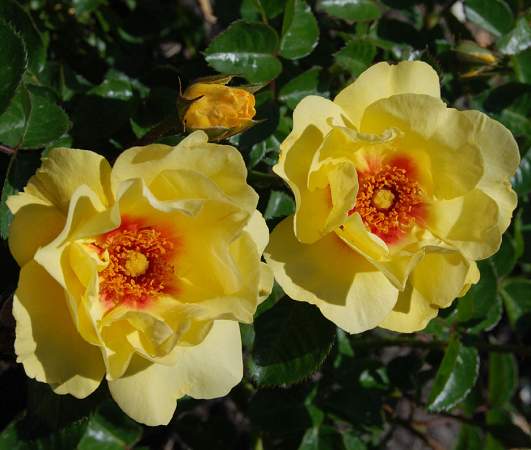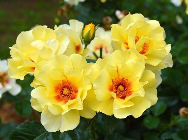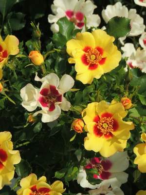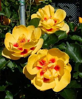 Роза плетистая Eyeconic (Айконик). Цвести данный сорт начинает рано. Куст покрывается яркими желтыми цветками с красным центром. Цветки размером 10-12 см наполняют воздух приятным персиковым ароматом. Если этот сорт выращивать в горшке, то в высоту он будет достигать 50-60 см, а если в открытом грунте, то 100-150 см.
