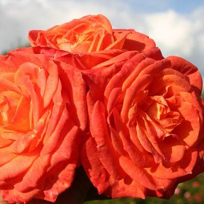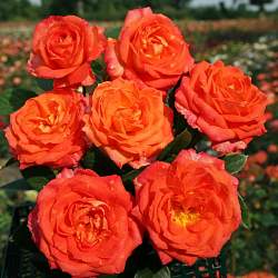 Роза Feurio (Фойрио). Роза, которую трудно отнести к какой-либо известной группе: для флорибунды она слишком мощная, для шраба — не совсем типичная. В конце концов она попала в группу чайно-гибридных роз из-за её цветков.