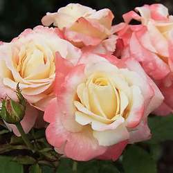 Роза Fiji (Фиджи). Цветки кремовые, с розовыми краями. Цветение обильное, куст с многочисленными побегами. Подходит как для групповой, так и одиночной посадки. Сорт пригоден для срезки.