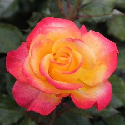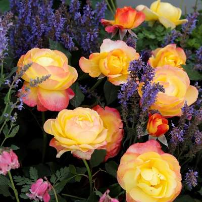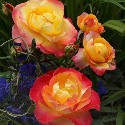 Роза Flaming Star (Флэминг Стар). Новинка на рынке 2017 года — двухцветная роза селекции Тим Герман Кордес из коллекции "Eleganza" с махровыми золотисто-жёлтыми с красно-розовой каймой цветками. Цветки диаметром 10 см.