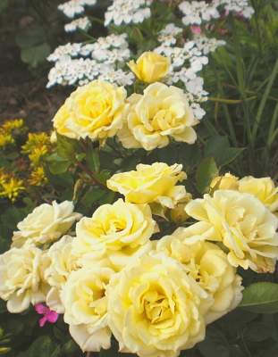 Роза Flower Power Gold (Флауэр Пауэр Голд). Цветки многочисленные, красиво сформированные, золотисто-жёлтые, блестящие, в соцветиях. Открываются медленно и держатся долго. Аромат лёгкий.
