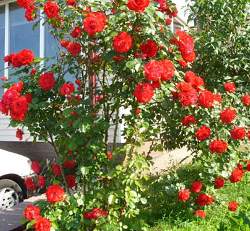 Роза Fluorescent (Флюорессан). Высокий куст, стройный, мощный, хорошо разветвленный, до 150 см. Цветки очень яркие, чашевидные, махровые (до 40 лепестков), собраны в соцветия по 3-5 шт.
