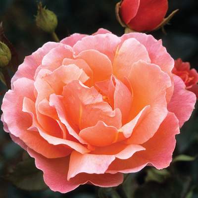 Роза флорибунда Fragrant Delight (Фрагрант Делай). Бутон темно-оранжевый, заостренный. Цветок оранжево-розовый, чашевидный, махровый, диаметр цветка — около 7 см, обладает насыщенным ароматом. Цветение обильное, цветки собраны в соцветия. Куст компактный, высота растения 90 — 105 см, ширина 75 см, лист темно-зеленый, средний, сильно-глянцевый.