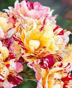 Роза Freska Romana (Фреска Романа). Яркая пестрая роза, очень заметная. Цветки до 8 см в диаметре, махровые, полосатые, красно-жёлтые с центром из золотистых тычинок, собраны в пышные соцветия. Лепестки со слегка волнистыми краями.