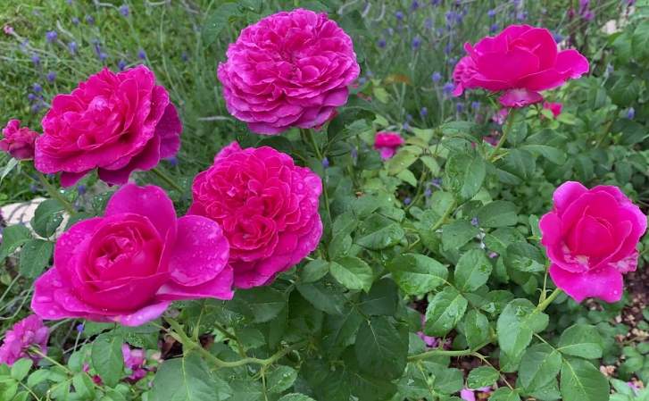 Роза Gabriel Oak (Габриэль Оук). Сильный стройный округлый куст, имеющий округлую форму. Высота и диаметре 125 см. Побеги фиолетовые, листья темно-зеленые. Цветки — махровые розетки темно-розового цветка с оттенком пурпура. Со временем края лепестков слегка бледнеют. Аромат сильный, фруктовый.