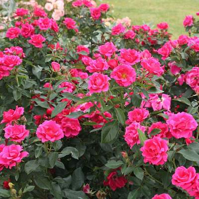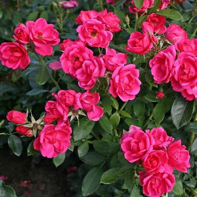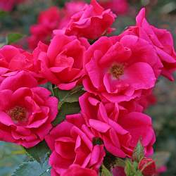 Роза Gartenfreund (Гартенфрёнд). Почвопокровная роза из коллекции Rigo-Roses. Цветки клубнично-красные, некрупные, густомахровые, в кистях, очень устойчивы к дождю. Аромата нет.