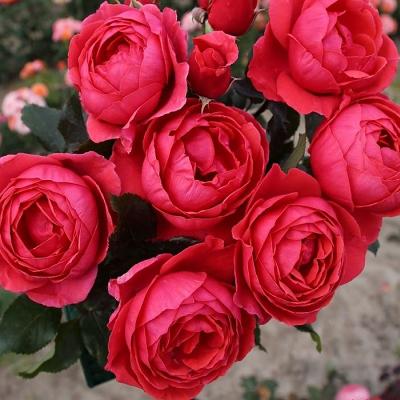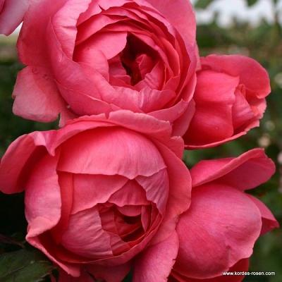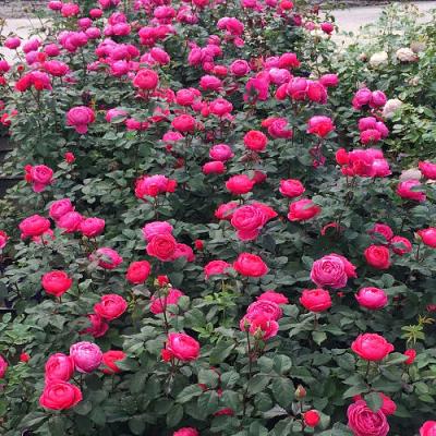 Роза Gartenprinzessin Marie-Jose (Гартенпринцессин Мари-Хосе). Цветки диаметром 5-6 см, махровые, шаровидные, розово-красные. Аромат сильный, фруктово-цветочный, наиболее интенсивно проявляется утром и вечером. Цветение повторное. Листва устойчивая к чёрной пятнистости и мучнистой росе. Куст стройный, вертикально растущий, высотой 80 см и шириной 40 см. Морозостойкость -29°C.