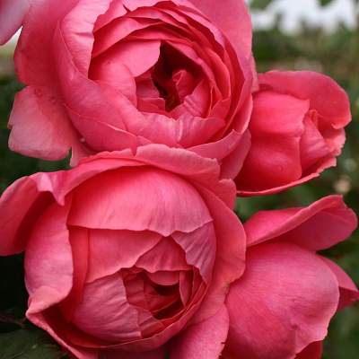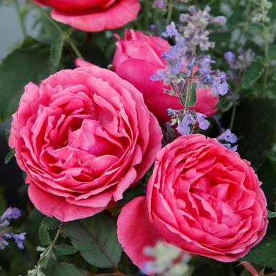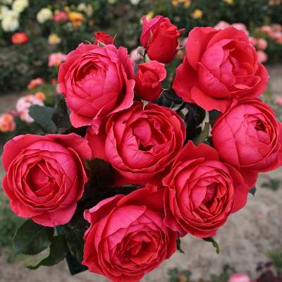 Роза Gartenprinzessin Marie-Jose (Гартенпринцессин Мари-Жозе). Цветки диаметром 5-6 см, махровые, шаровидные, розово-красные. Аромат сильный, упоительный, фруктово-цветочный, наиболее интенсивно проявляется утром и вечером.