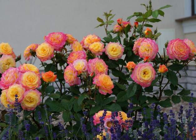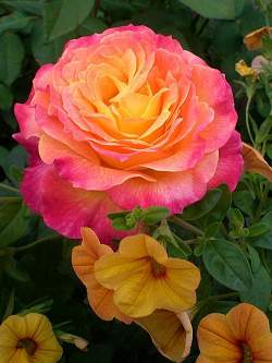 Роза Gartenspass (Гартеншпас). Роза-хамелеон. Желто-оранжевые или просто желтые махровые (40-60 лепестков) чашевидные цветки с красной или ярко-розовой каймой-румянцем появляются из желто-оранжевых бокаловидных бутонов.