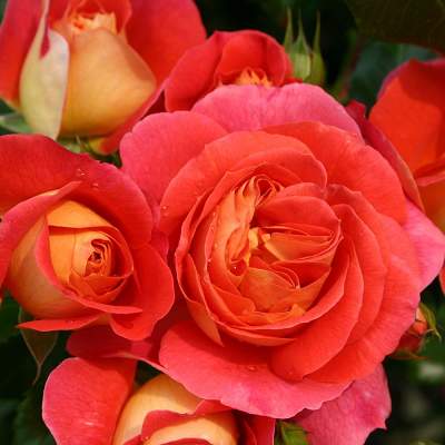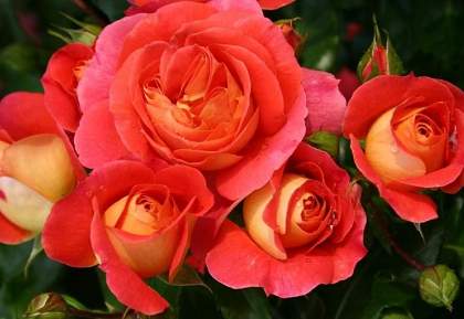 Роза флорибунда Gebruder Grimm (Гебрюдер Гримм, Браться Гримм). Цветки сияюще-оранжевые с жёлтым реверсом, густомахровые, в крупных кистях. Листва тёмно-зелёная, очень блестящая. Яркий цвет и первоклассная устойчивость к заболеваниям делают ее естественным выбором как для клумб, так и для одиночной посадки. Куст очень сильнорослый, ветвистый.