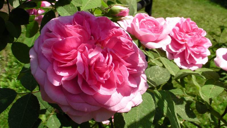 Роза Gertrude Jekyll (Гертруда Джекил). Довольно маленькие бутоны неожиданно распускаются в крупные махровые цветки глубокого розового тона, красивой розеточной формы, как у старинных роз. Аромат сильный, великолепный, полностью сбалансированный, как у старинных английских роз (само воплощение розового аромата!). Листва подобна портлендской розе, с типичными портлендскими широко-раздельными листочками.