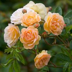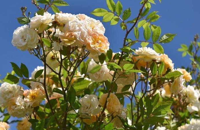 Роза Ghislaine de Feligonde (Гислен де Фелигонд). Эту популярную розу можно выращивать как плетистую или как крупный шраб. Бутоны ярко-оранжевые, цветки же очень изменчивы по цвету. В жару они бледно-абрикосовые, быстро выгорают до белых, в холодную погоду и осенью гораздо более розовые, и меньше выгорают.