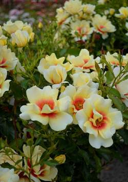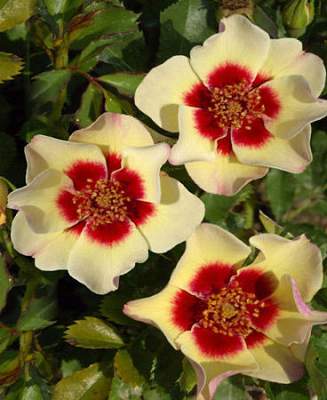Эта роза с цветками до 6 см, простыми, бледно-жёлтыми с красным пятном в основании лепестков. Наслаждение наблюдать, как разворачивается, раскрывается каждый лепесток по-своему неповторимого и прекрасного цветка. Окраска цветков в процессе цветения меняется. Цветение обильное, повторное в течение сезона. Листва устойчивая к заболеваниям. Куст компактный, высотой 50-70 см.