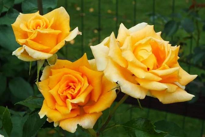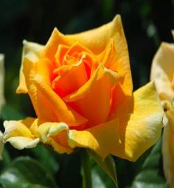 Роза Golden Monica (Голден Моника). Бутоны стройные, радостного медно-красно-желтого оттенка. Цветки желто-оранжевые, диаметром 8-10 см. Аромат легкий. Очень хороша в срезке. Кусты сильные, пряморослые, высотой 80-100 см. Цветоносы длинные, прочные. Листва крупная, темно-зеленая, глянцевая, красиво контрастирует с цветами.