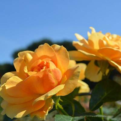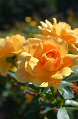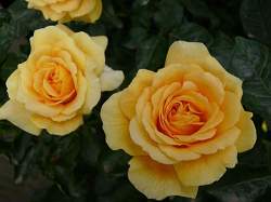 Роза Golden Years (Голден Йеаз). Одна из лучших роз Харкнесса: темная листва, яркая окраска, и волнистые лепестки, придающие цветкам шарм. Цветки бледно-оранжевые с золотыми и абрикосовыми тонами. Более темная окраска с изнанки создает темно-золотистые тени между лепестками, даже когда цветок полностью распустится.