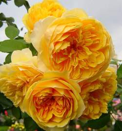 Роза Graham Thomas (Грэхем Томас). Этот великолепный сорт — одна из самых популярных английских роз, и также одна из самых изменчивых. Бутоны варьируют по цвету от персиковых до красных, раскрываются они в чашевидные махровые 7-10 см цветки, обычно ярко-жёлтые, в некоторых условиях с персиковыми тонами, с возрастом выгорают до более светлых.