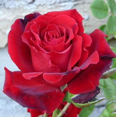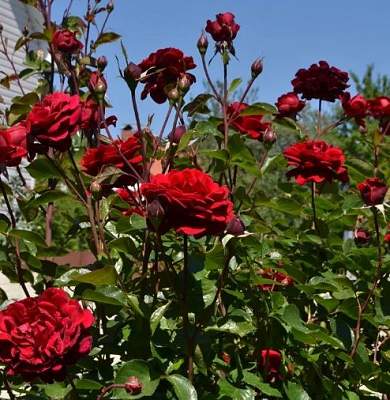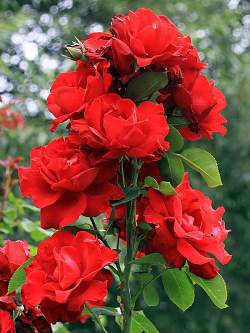 Роза плетистая Grandessa (Грандесса). Другое название — Messire Delbard (Мессир Дельбар). Цветки огненные, сияющие, ало-красные, бархатистые, махровые, наполненные лепестками, благородной формы, как у классических чайно-гибридных роз.