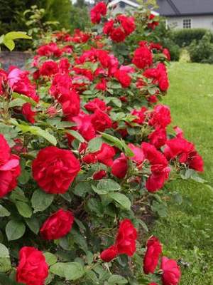 Роза шраб Hansaland (Хансаланд). Цветки полумахровые, сияюще-красные, устойчивы к дождю. Куст компактный. Высокая устойчивость к болезням. Идеальная роза для заднего плана, в группах с кустарниками. Хороший жёсткий каркас, гирлянды изящно поникающих цветков и прекрасные листья — сумма достоинств идеального сорта для живой изгороди.