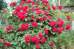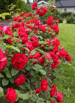 Роза Hansaland (Хансаланд). Цветки полумахровые, чайно-гибридной формы, сияюще-красные, устойчивы к дождю. Куст компактный. Высокая устойчивость к болезням. Идеальная роза для заднего плана, в группах с кустарниками. Хороший жёсткий каркас, гирлянды изящно поникающих цветков и прекрасные листья — сумма достоинств идеального сорта для живой изгороди.