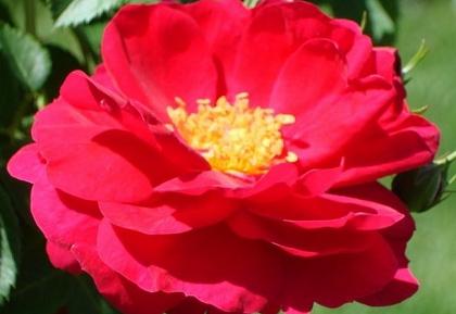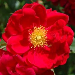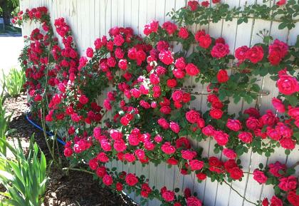 Роза Henry Kelsey (Генри Келси). Этот клаймбер вырастает примерно до 300 см. Цветки среднего размера (6-7 см), полумахровые, ярко-красные, выгорают до ярко-розовых, показывают серединку. Появляются в кистях по 10-20 шт все лето и осень.