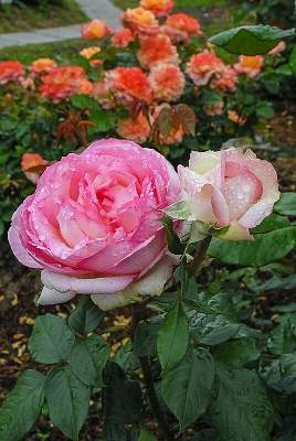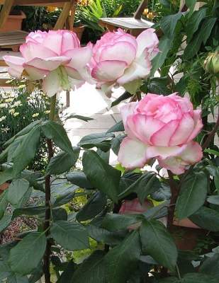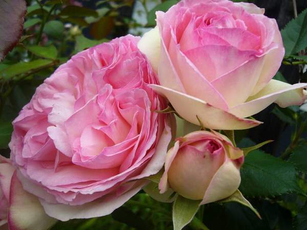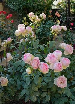 Роза Honore de Balzac (Онорэ де Бальзак). Одно из ярких достоинств этой розы — аромат. Многие отмечают, что в аромате чувствуются ноты персика. Когда прекрасный цветок раскрывается, он похож на крупную чашу. Лепестки двухцветные — белые с розовой каймой. Цветки крупные. Цветение сериям волн. Куст красивый, сильнорослый.