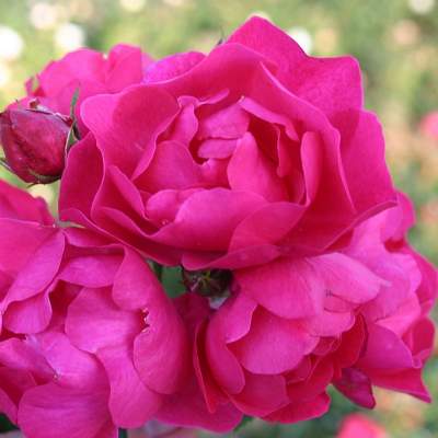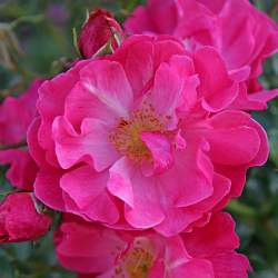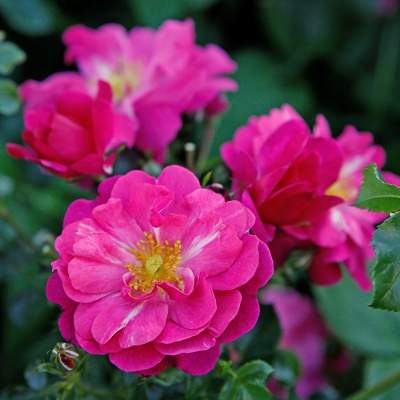 Роза Hotline (Хотлайн). Цветки полумахровые, диаметром 4-5 см, ярко-розовые, в соцветиях, красиво контрастируют с тёмно-зелёной глянцевой листвой. Цветение повторное, первое цветение всегда очень обильное. Листва полностью устойчивая к чёрной пятнистости и мучнистой росе.