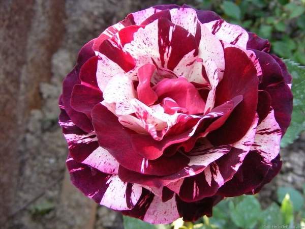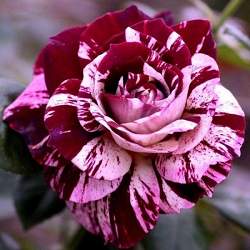 Роза Imagine (Имэджин). Кремово-сиреневые с фиолетово-малиновыми, бордовыми, красными полосками и пятнами цветки, чашевидной формы, средне-махровые (17-25 лепестков), в полном роспуске показывают серединку, собраны в соцветия на прямостоячих побегах, отливающих пурпуром, обладают насыщенным ароматом.