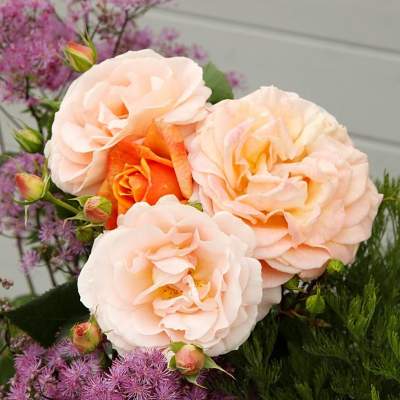 Цветки диаметром 6-7 см, махровые (17-25 лепестков), смешанных оранжевых оттенков. Аромат лёгкий. Цветение повторное. После первого цветения даже без обрезки хорошо наращивает новые молодые побеги.