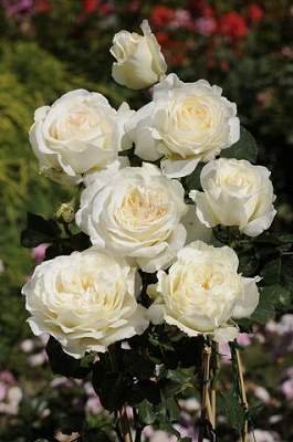 Роза чайно-гибридная Irina (Ирина) на штамбе 90 см. Очень быстро кустится и набирает бутоны. Цветки в полуроспуске сливочные, потом белые, огромные, размером с тарелку. Источают сильнейший медовый аромат. Невозможно отойти от этих цветков, хочется в них жить. Вдыхаешь аромат и сожалеешь, что ты не Дюймовочка.
