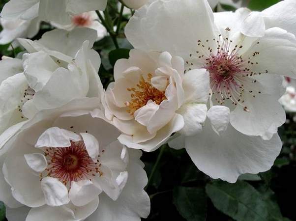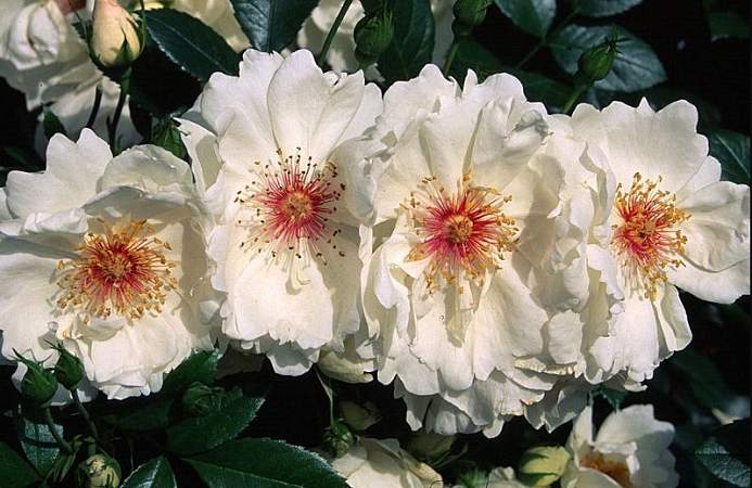 Роза Jacqueline du Pre (Жаклин дю Пре). Красивый куст идеальной куполообразной формы. Густая темно-зеленая листва долго сохраняет декоративность. С начала мая и до поздней осени цветет роскошными кистями белых цветков. Создается такое впечатление, что куст припорошен снегом.