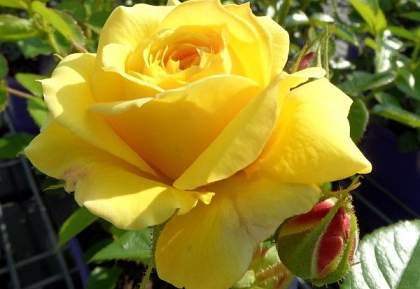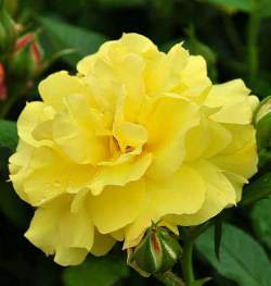 Роза Jan Spek (Жан Спек). Ярко-желтые, средне-махровые (в полном роспуске показывают серединку) цветки с мягким ароматом. Куст вертикальный, с темно-зеленой, глянцевой листвой.