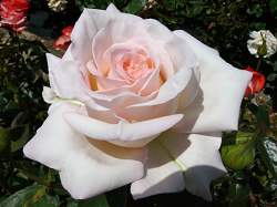 Роза Jardins de Bagatelle (Жардан де Багатель). Цветки крупные, красивой формы, но в первую очередь внимание привлекает их окраска — кремовая с розовым оттенком, а с изнанки темно-абрикосовая. Цвета немного выгорают со временем, но смесь сливочного и персикового в центре цветка остается до самого отцветания.