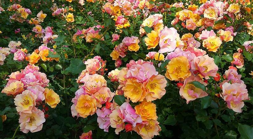 Роза Jazzz (Джаз) на штамбе 90 см. При таком обильном цветении сорт прекрасно самоочищается. Интересно, что даже открыв серединку, цветки не теряют привлекательности ввиду того, что тычинки настолько гармонируют с цветом лепестка, что практически сливаются в единое целое.