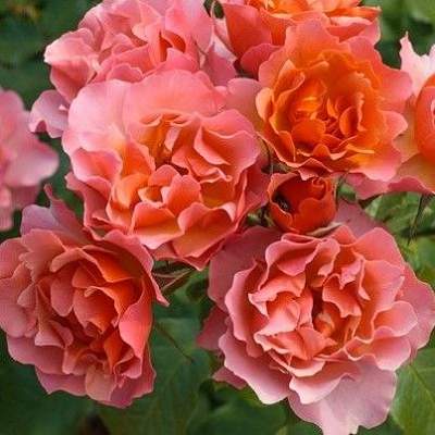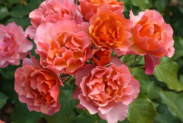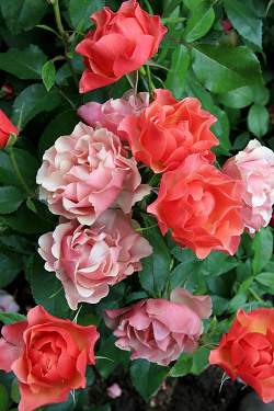 Роза Jean Cocteau (Жан Кокто). Цветет очень обильно, имеет красивый ровный куст. Окраска цветков меняется от розового до абрикосового, слегка выгорает на солнце до светло розового. Цветки полумахровые, чашевидные, с волнистыми лепестками, крупные. Собраны в большие соцветия. Каждый цветок держится до месяца!